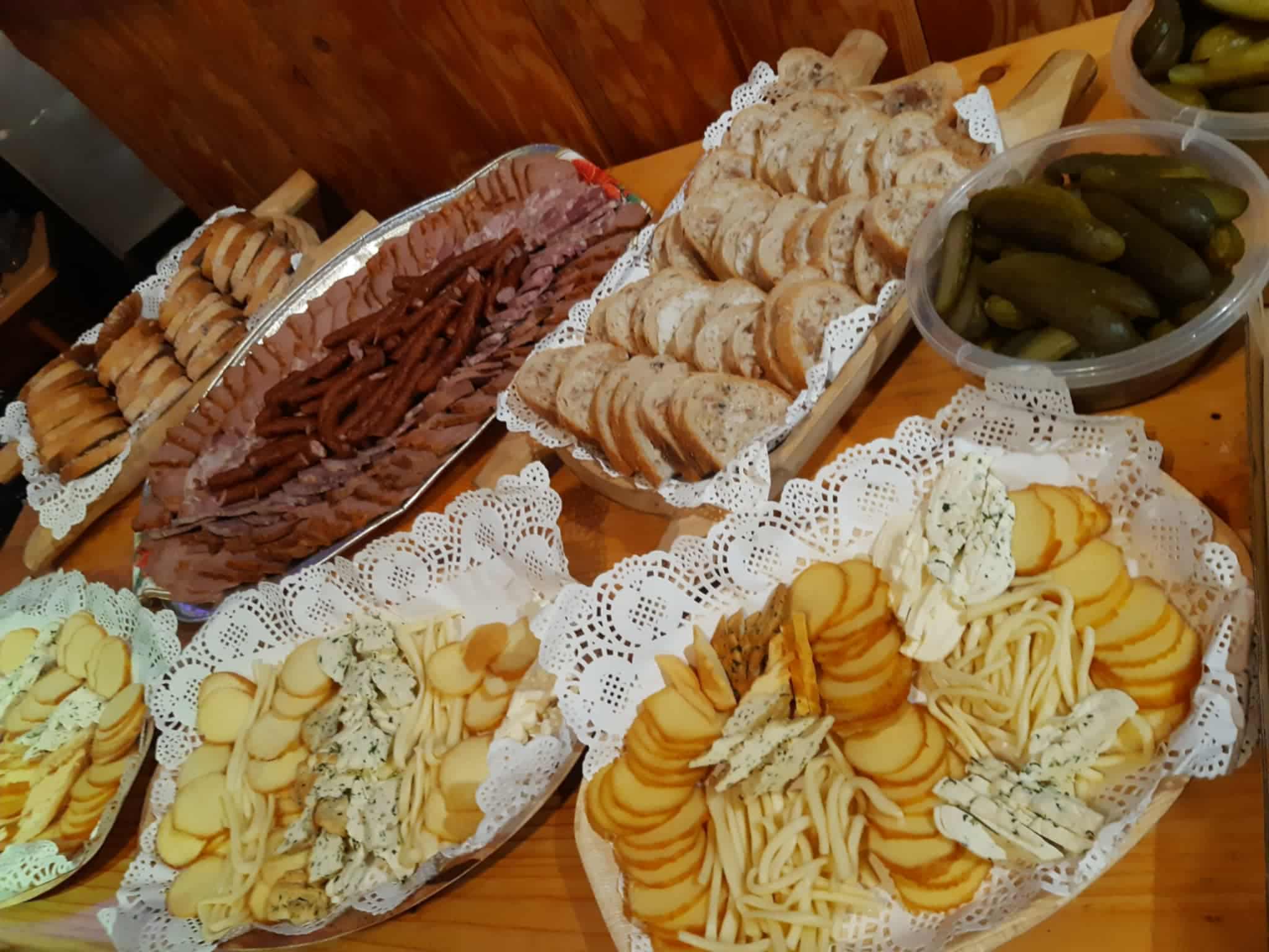 Kiełbaski, oscypek, zimna płyta, chleb ze smalcem, herbata zwykła i góralska, winko i dodatki.