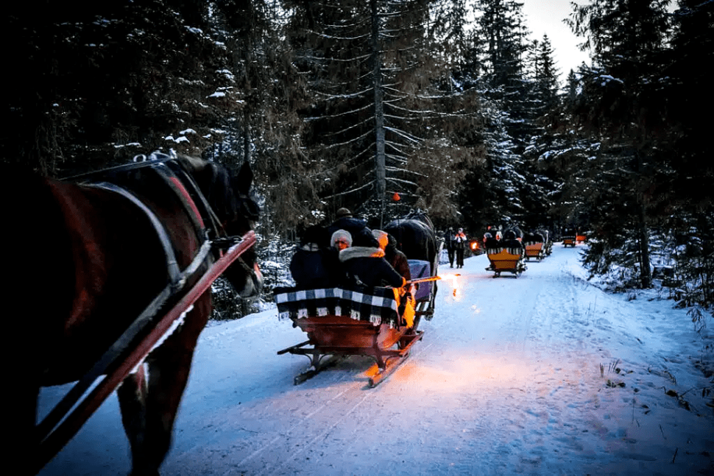 - Przy malej ilości śniegu kulig odbywa się dorożkami na kołach. trasa w głąb Doliny Chochołowskiej.