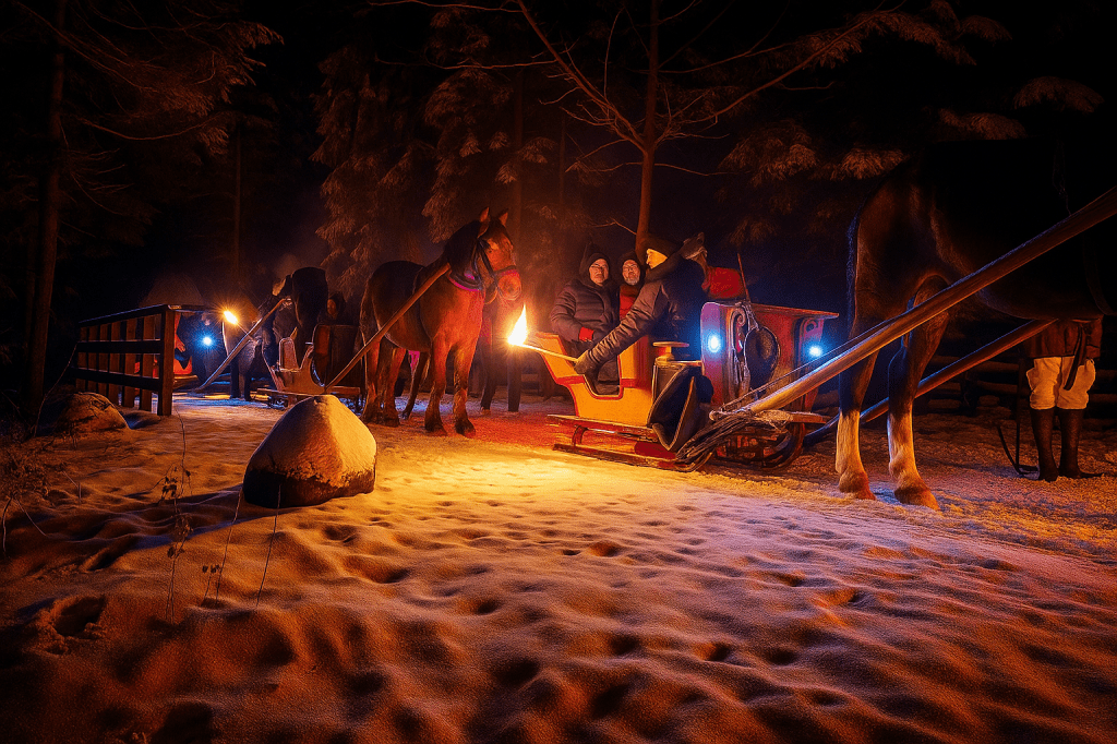 3. Przesiadka do sań 4 osobowych po czym rozpoczyna się godzinny kulig z pochodniami.* w przypadku braku śniegu lub zbyt małej ilości śniegu kuligi organizowane są dorożkami.