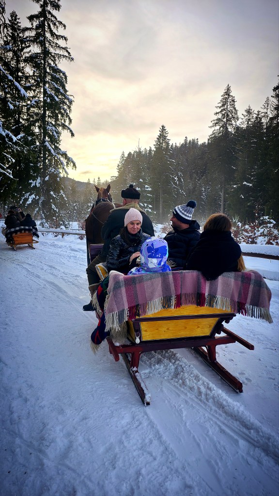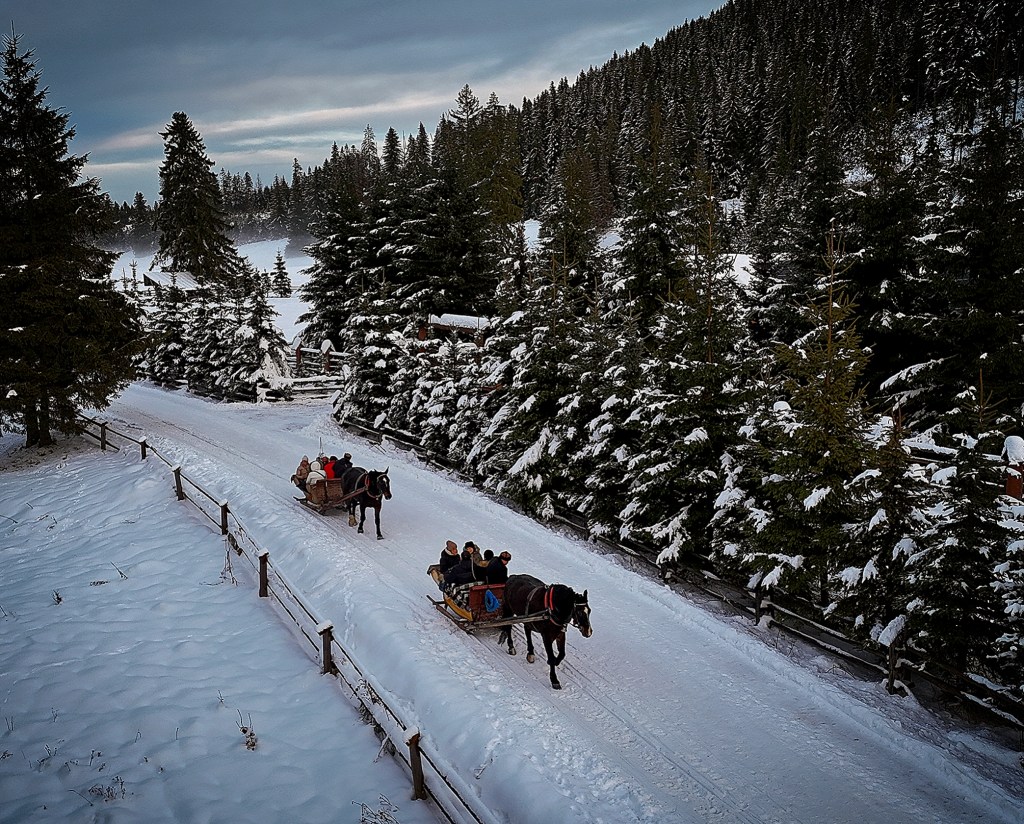 If there’s not enough snow, the sleigh ride will be in horse-drawn carriages, leading deep into the Chochołowska Valley.
